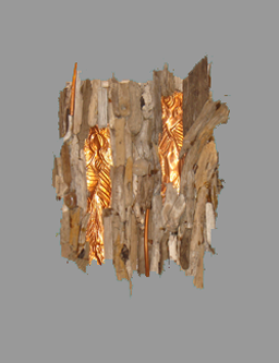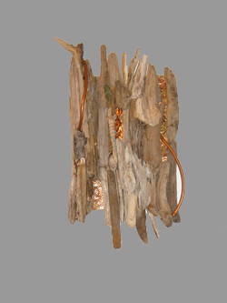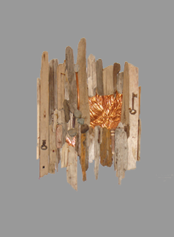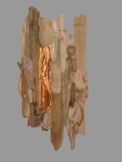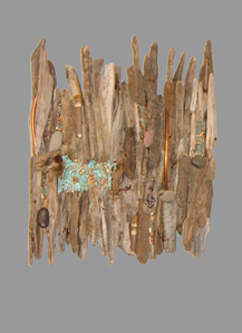 These works are constructed using driftwood, tumbled stone and other found objects to frame engraved copper art.